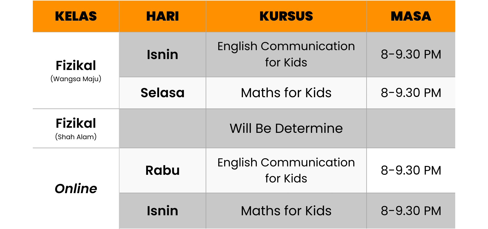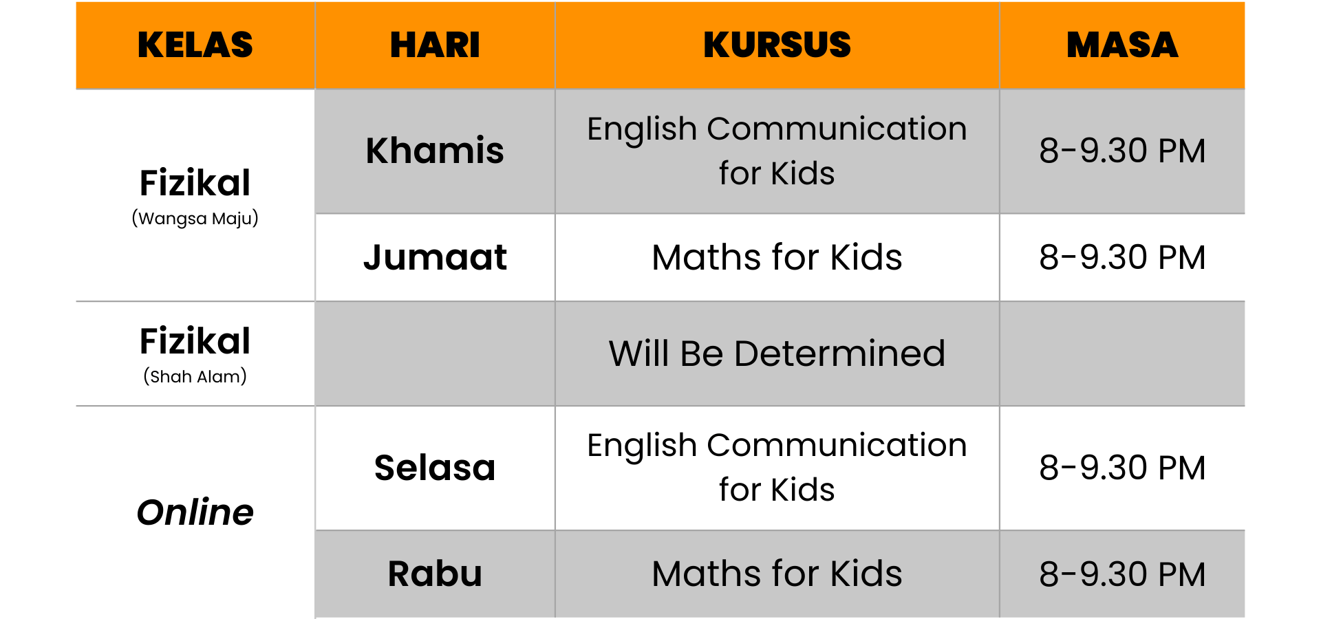 REGISTER YOUR KIDS NOW HASIL PEMBELAJARAN TAHUN 7 & 8 Mengira hingga 1 000Menyelesaikan tambah dan tolak dalam lingkungan 1000Mewakili pendaraban sebagai penambahan berulang serta pembahagian sebagai pengumpulan ke dalam set yang samaMengenalpasti tarikh dan bulanMengenal nilai wang syiling dan wang kertasMengenal bentuk dua dimensiMengumpul, menyusun dan mewakili data TAHUN 9 & 10 Mengira hingga 100 000Memahami pola nomborMengenali jenis pecahanMenukarkan peratus kepada pecahan dan perpuluhanMengira baki wang dalam transaksi mudahMenukar unit masa melibatkan tahun, bulan, minggu, hari dan jamMenggunakan unit metrik untuk panjang, jisim dan kapasitiMemadankan kedudukan pada petaMembaca, mendapat dan mempersembah data TAHUN 11 & 12 Mengira hingga 1 000 000Mengenal nombor perdana dan nombor kompositMengenali dan menyelesaikan operasi bergabungMenyelesaikan darab dan bahagi bagi pecahan dan perpuluhanMembuat perancangan belanjawan mudahMengenal sistem 12 jam dan 24 jamMenganalisis data dengan mengeluarkan mod, min, median, purata dan julat JADUAL